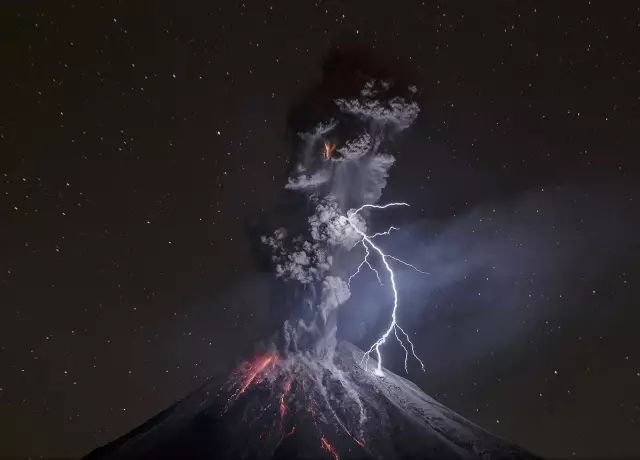 墨西哥科利马火山。一道闪电突然照亮了科利马火山,又恰逢火山喷发,熔岩夹杂着闪电喷薄而出,大量火山灰和浓烟瞬间弥漫天际,这无疑是摄影师一生中最激动的时刻。