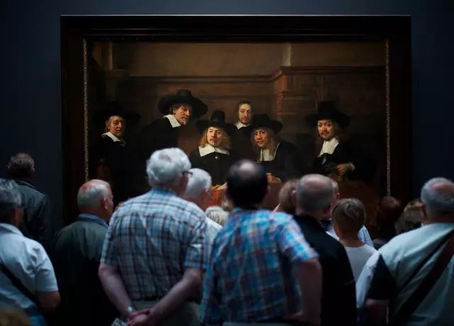 荷兰阿姆斯特丹国家博物馆,一群观众在端详伦勃朗的画作《布商行会的理事们》(Syndics of the Drapers’ Guild),画中的人们似乎也在好奇地看着画作前的围观者,面面相觑,场面十分有趣滑稽。