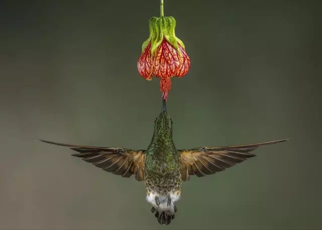 厄瓜多尔的森林,一只黄尾冕蜂鸟正在采集花蜜。南美的热带丛林是蜂鸟的天堂,而这张照片胜在极强的对称美感。