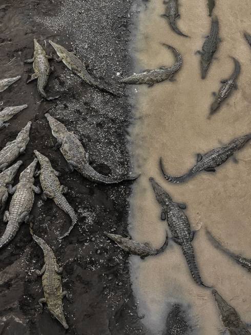 哥斯达黎加,塔尔科莱斯河畔,这里聚集着30到40条鳄鱼,它们在泥水中缓慢地沉浮、谨慎地注视着前方。摄影师选择将画面一分为二,水浊泥沉、群鳄蠕动,混沌之中又似有一股秩序井然,使人震撼。