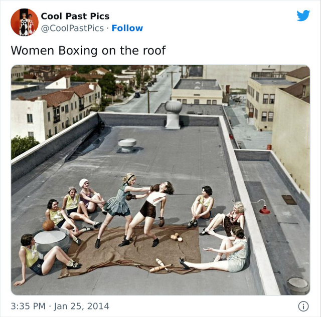 4.1950年代,几个年轻的女孩在屋顶练习拳击。