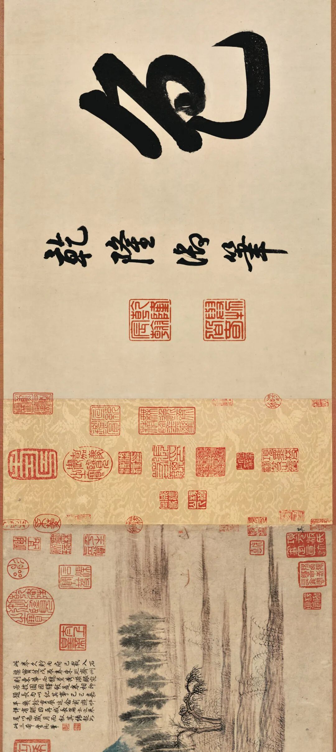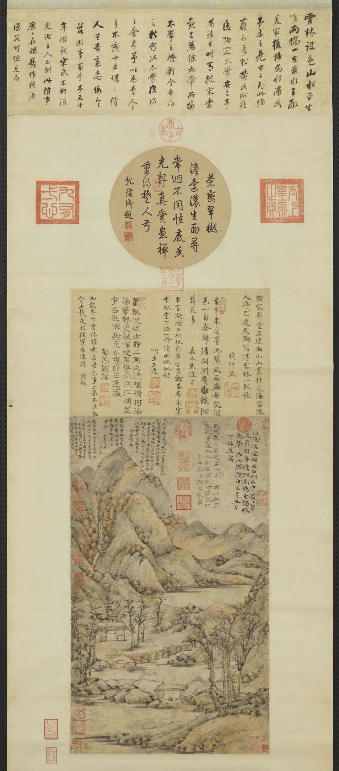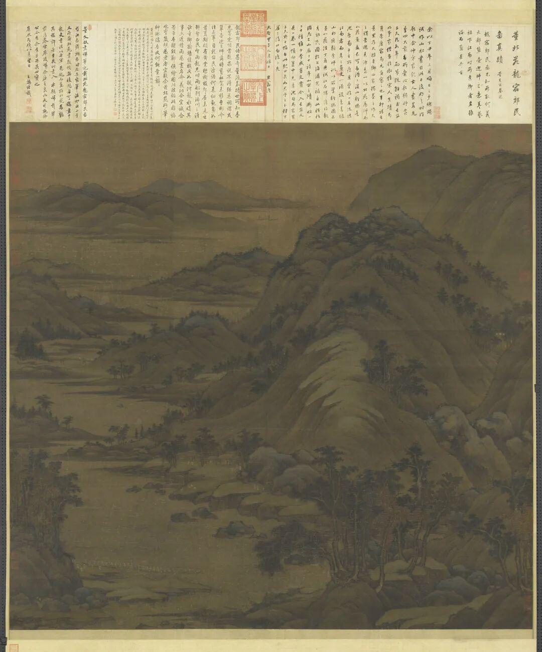 巨然是五代宋初的僧人画家,擅绘烟岚晓景,技法师董源而更雄秀奇艺,趋于成熟,在画史上与董源并称“董巨”。本画就是一幅描绘大雨过后山峦林间烟岚气象的作品。诗堂上有明代大家董其昌书写的“僧巨然真迹神品。观此图始知吴仲圭师承有出蓝之能,元四大家之自本自根非易易也”的题跋。吴仲圭是指元四家之一的吴镇,此话表明巨然画风对后世元四家影响很大,其背后理念正是董其昌南北宗的理论。
