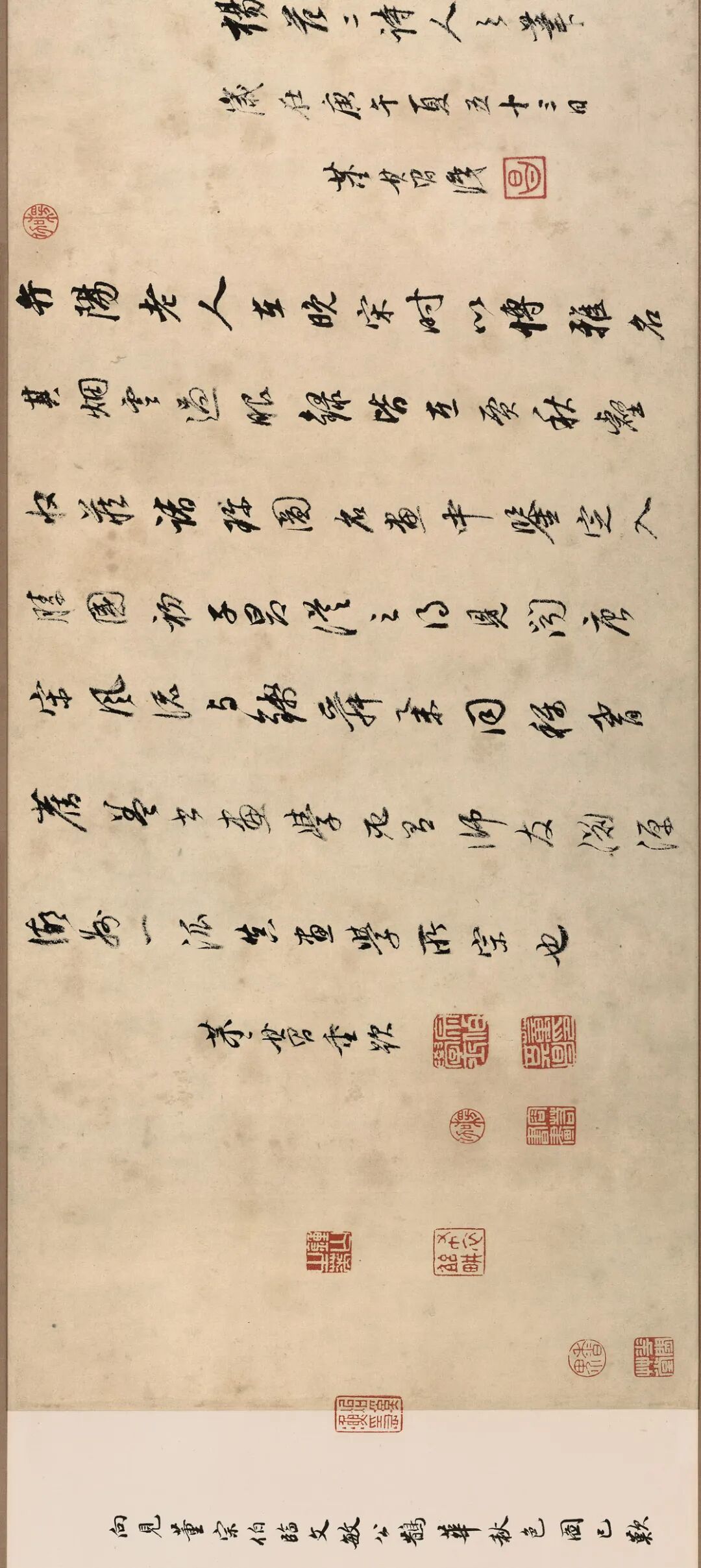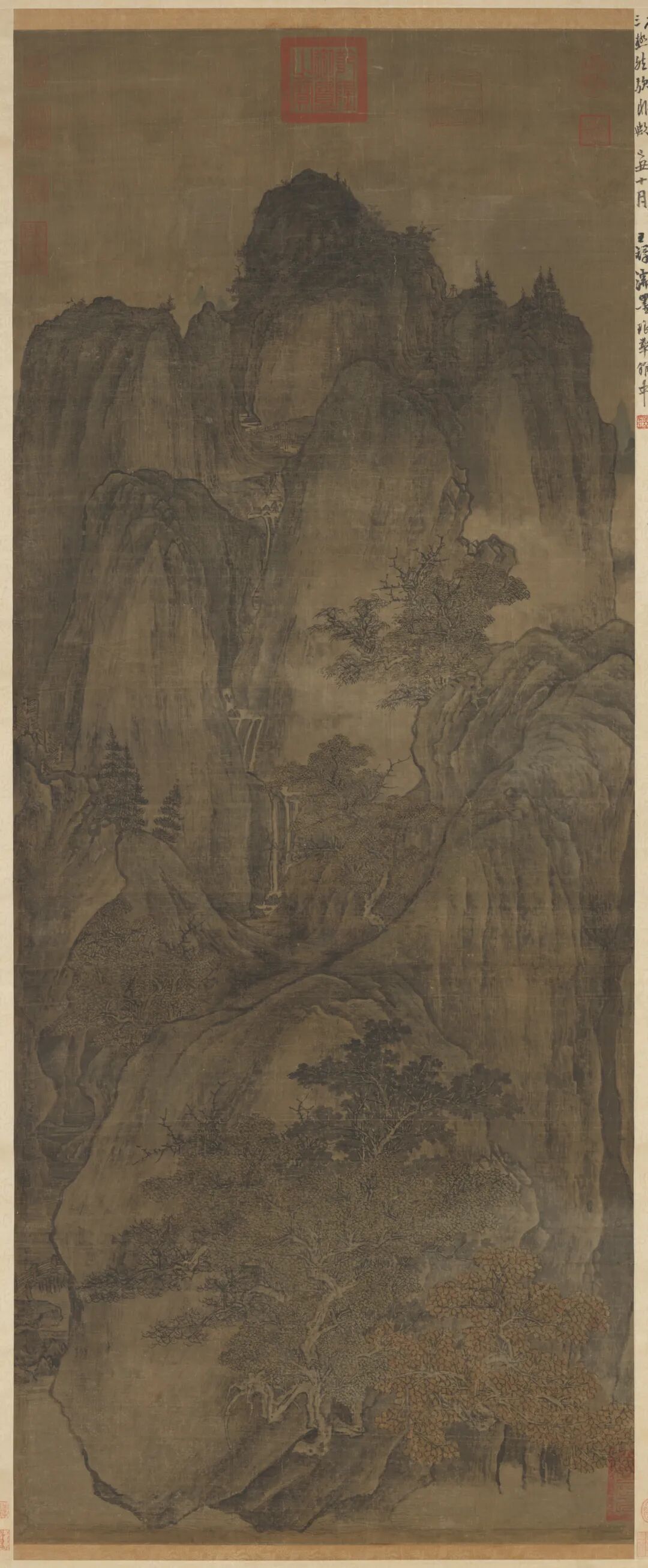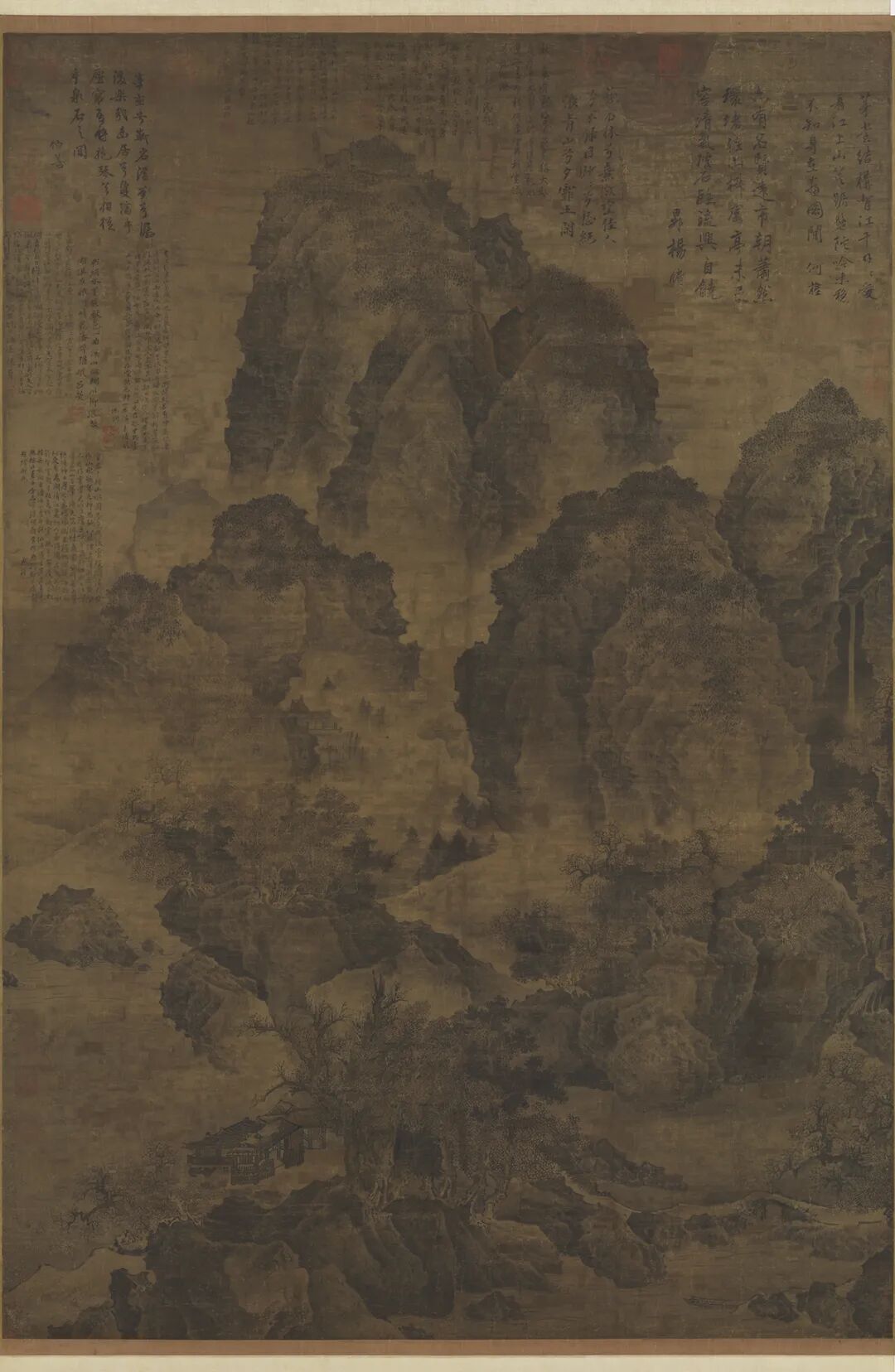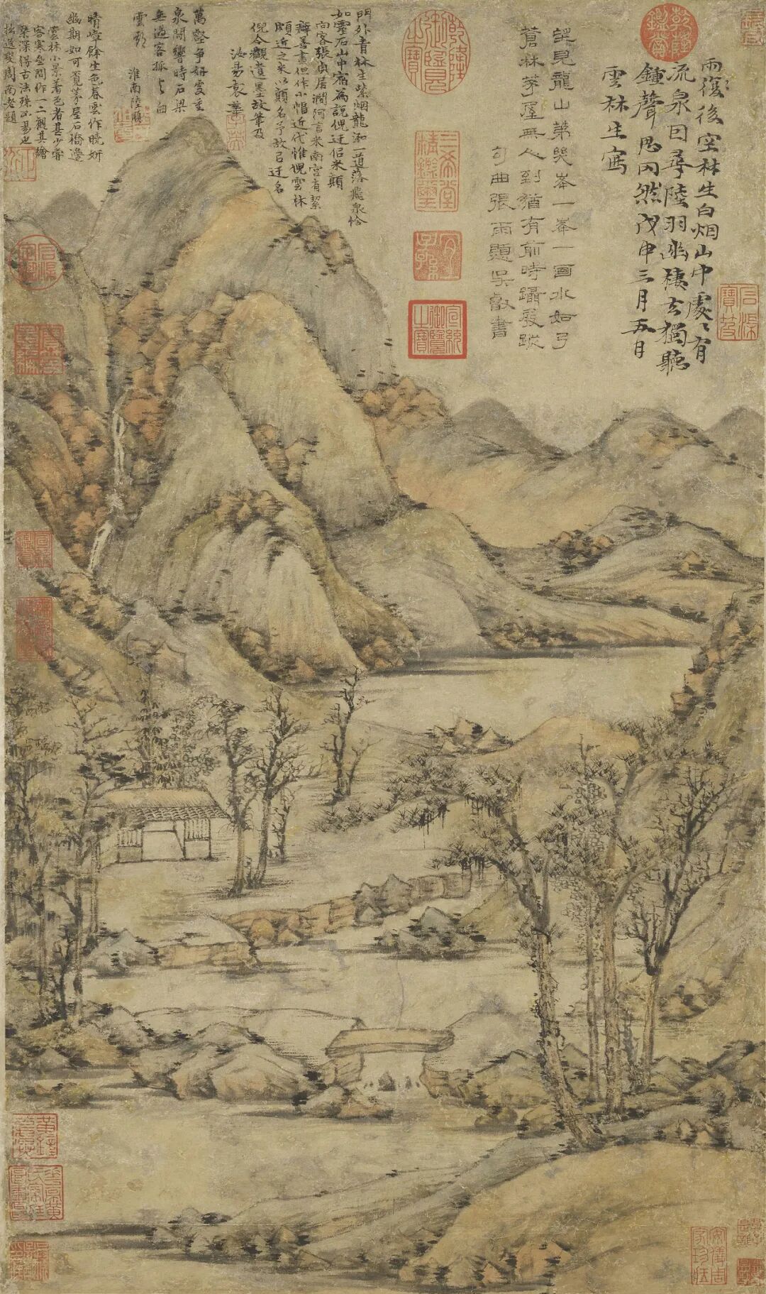 巨然是五代宋初的僧人画家,擅绘烟岚晓景,技法师董源而更雄秀奇艺,趋于成熟,在画史上与董源并称“董巨”。本画就是一幅描绘大雨过后山峦林间烟岚气象的作品。诗堂上有明代大家董其昌书写的“僧巨然真迹神品。观此图始知吴仲圭师承有出蓝之能,元四大家之自本自根非易易也”的题跋。吴仲圭是指元四家之一的吴镇,此话表明巨然画风对后世元四家影响很大,其背后理念正是董其昌南北宗的理论。