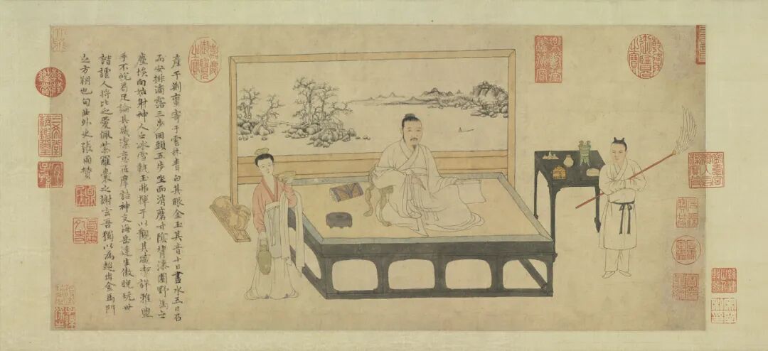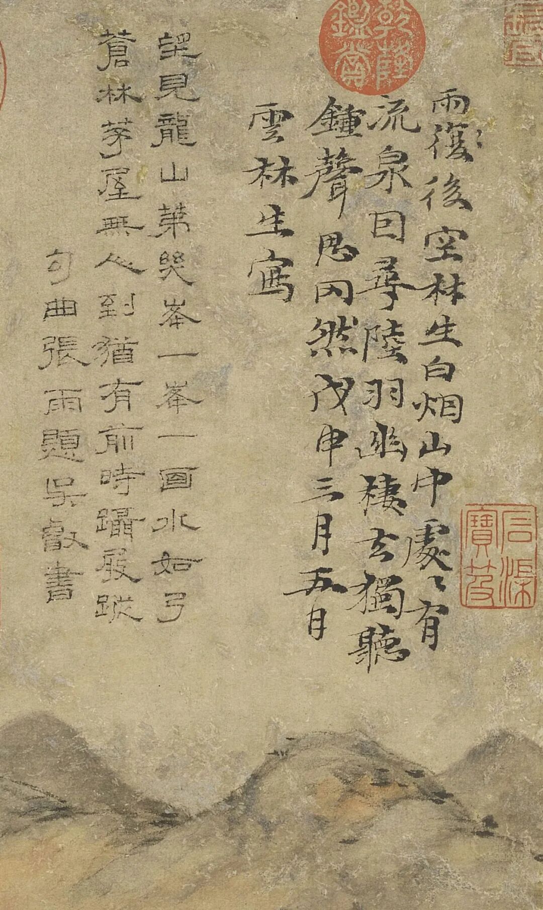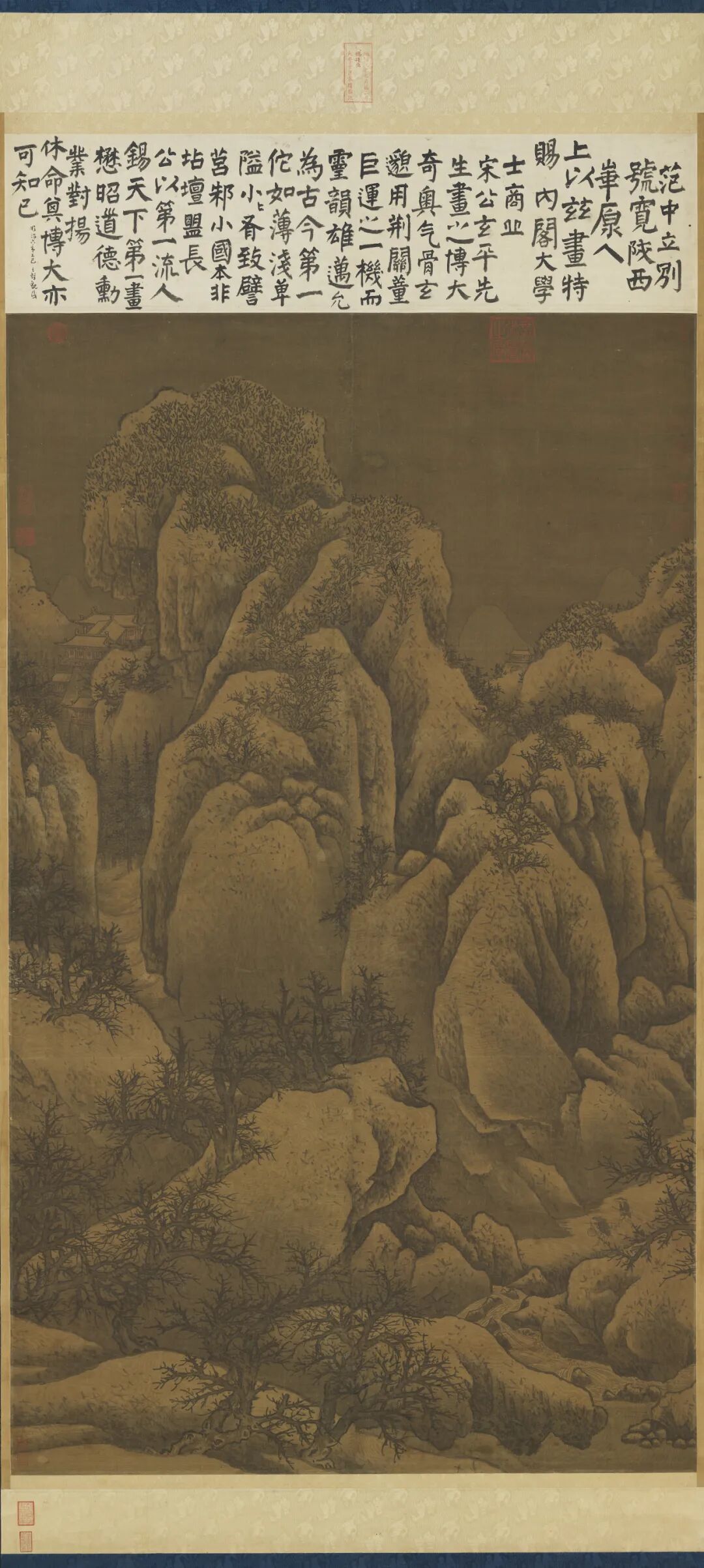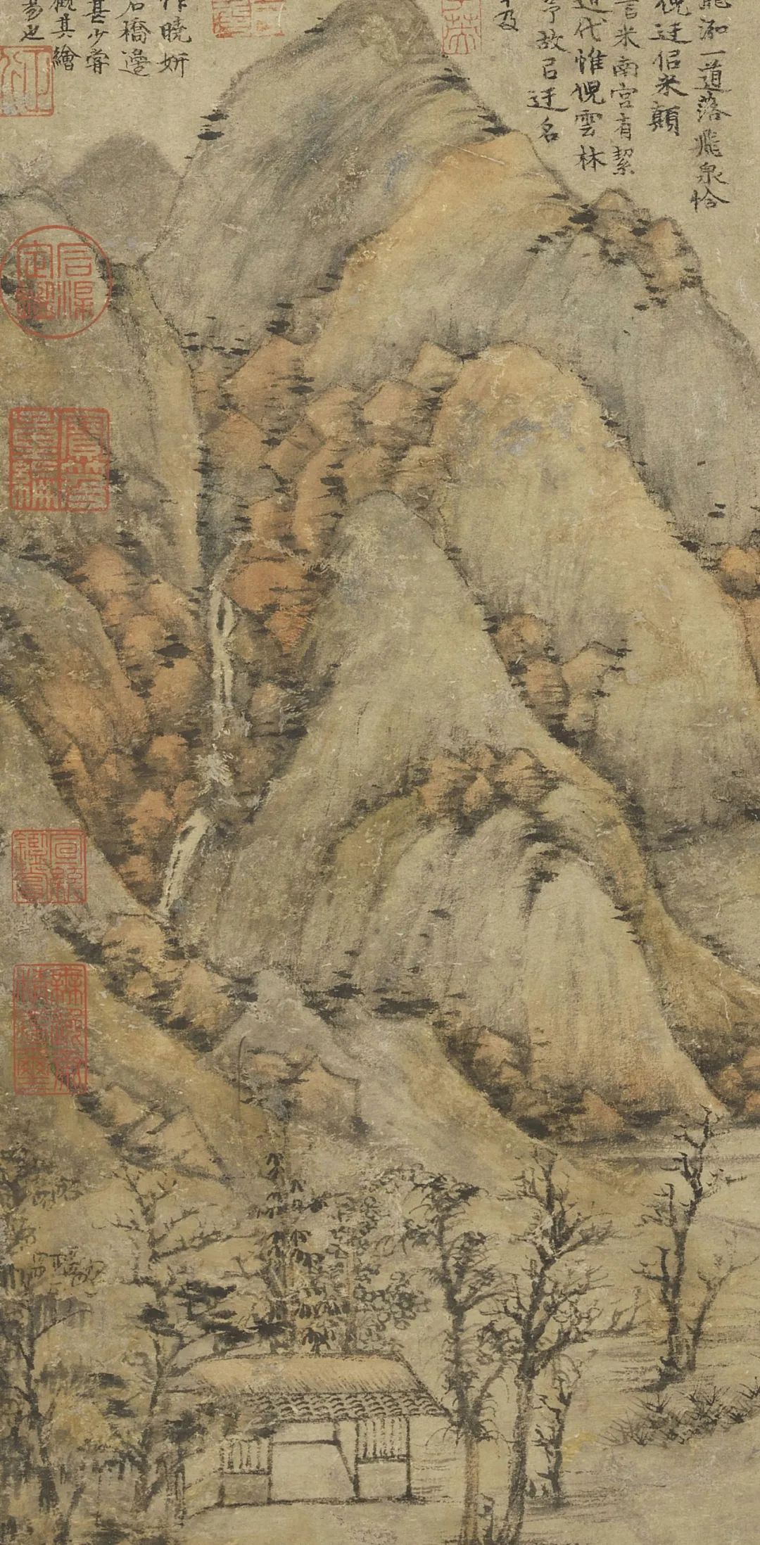 巨然是五代宋初的僧人画家,擅绘烟岚晓景,技法师董源而更雄秀奇艺,趋于成熟,在画史上与董源并称“董巨”。本画就是一幅描绘大雨过后山峦林间烟岚气象的作品。诗堂上有明代大家董其昌书写的“僧巨然真迹神品。观此图始知吴仲圭师承有出蓝之能,元四大家之自本自根非易易也”的题跋。吴仲圭是指元四家之一的吴镇,此话表明巨然画风对后世元四家影响很大,其背后理念正是董其昌南北宗的理论。