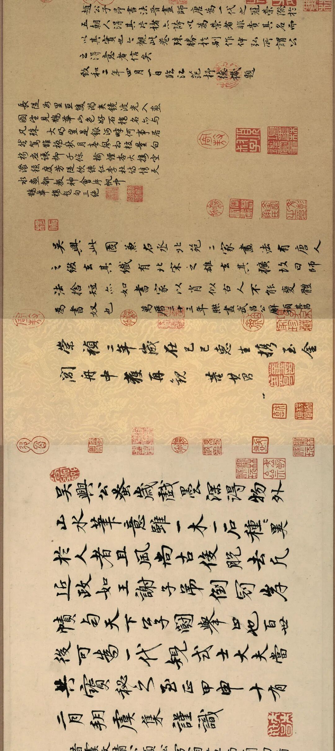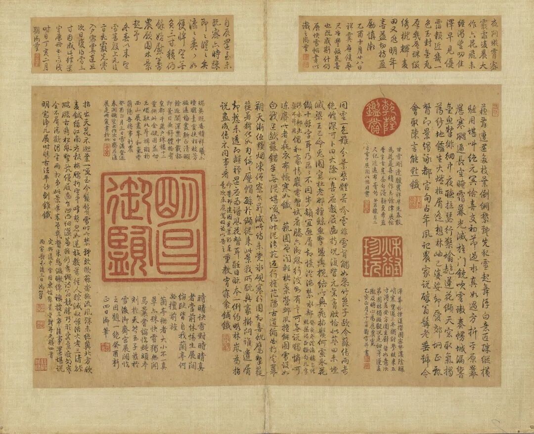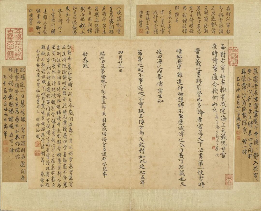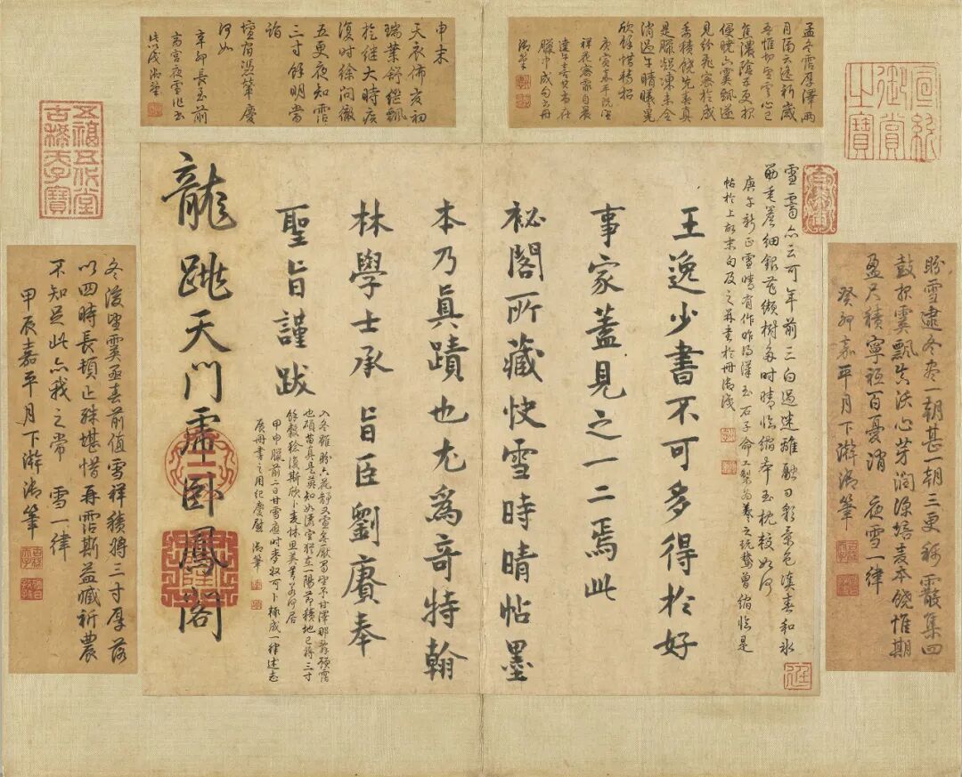 它不仅在乾隆十一年(1746年)与王献之的《中秋帖》以及王珣的《伯远帖》合称“三希”,一起放在宫内“三希堂”中,成为“三希堂”第一珍品。而且乾隆皇帝还在接下来的五十年间于《快雪时晴帖》上共亲自御笔题识71则,晚年因视力不佳,写不动了,又让董诰代笔三则,可见乾隆皇帝对此帖之热爱。