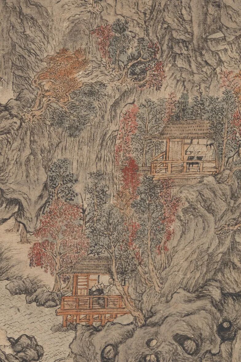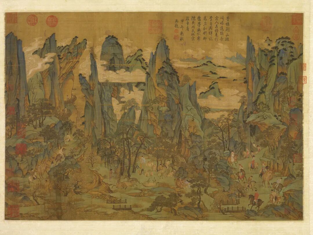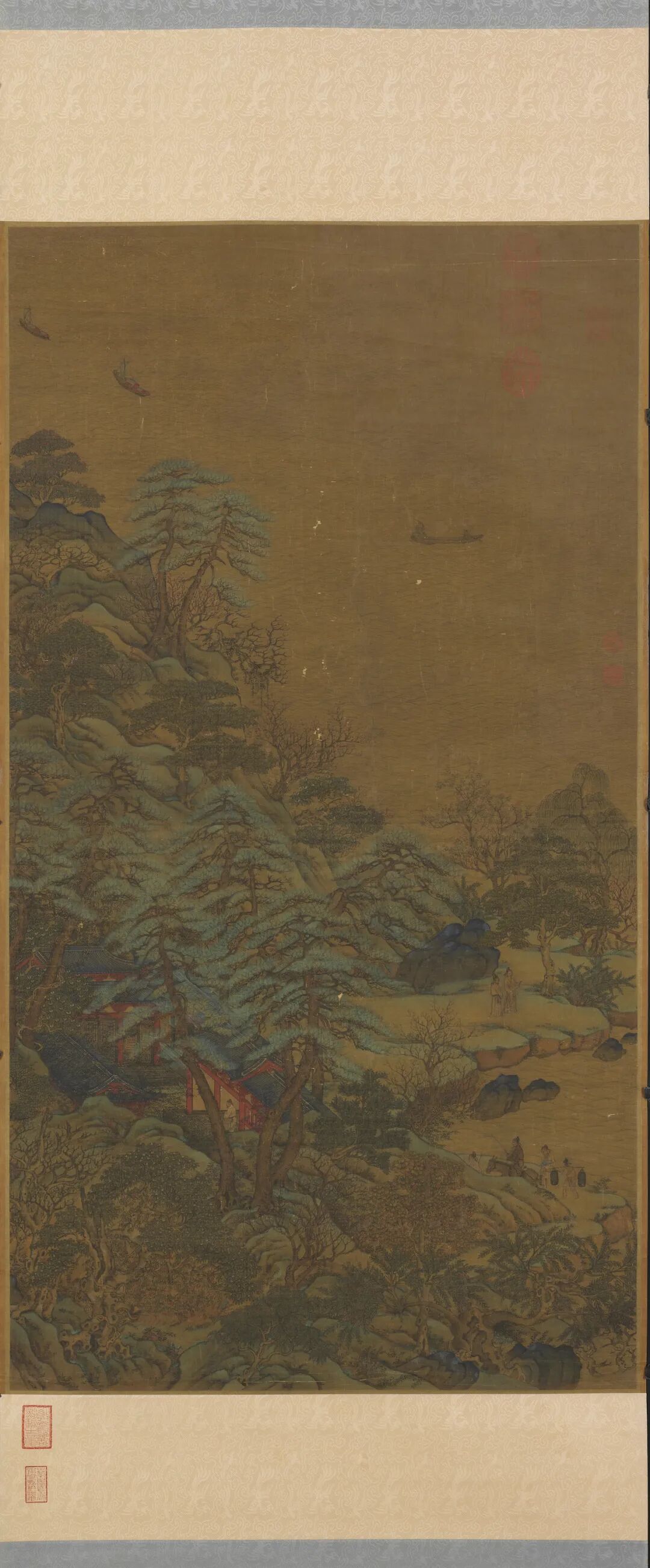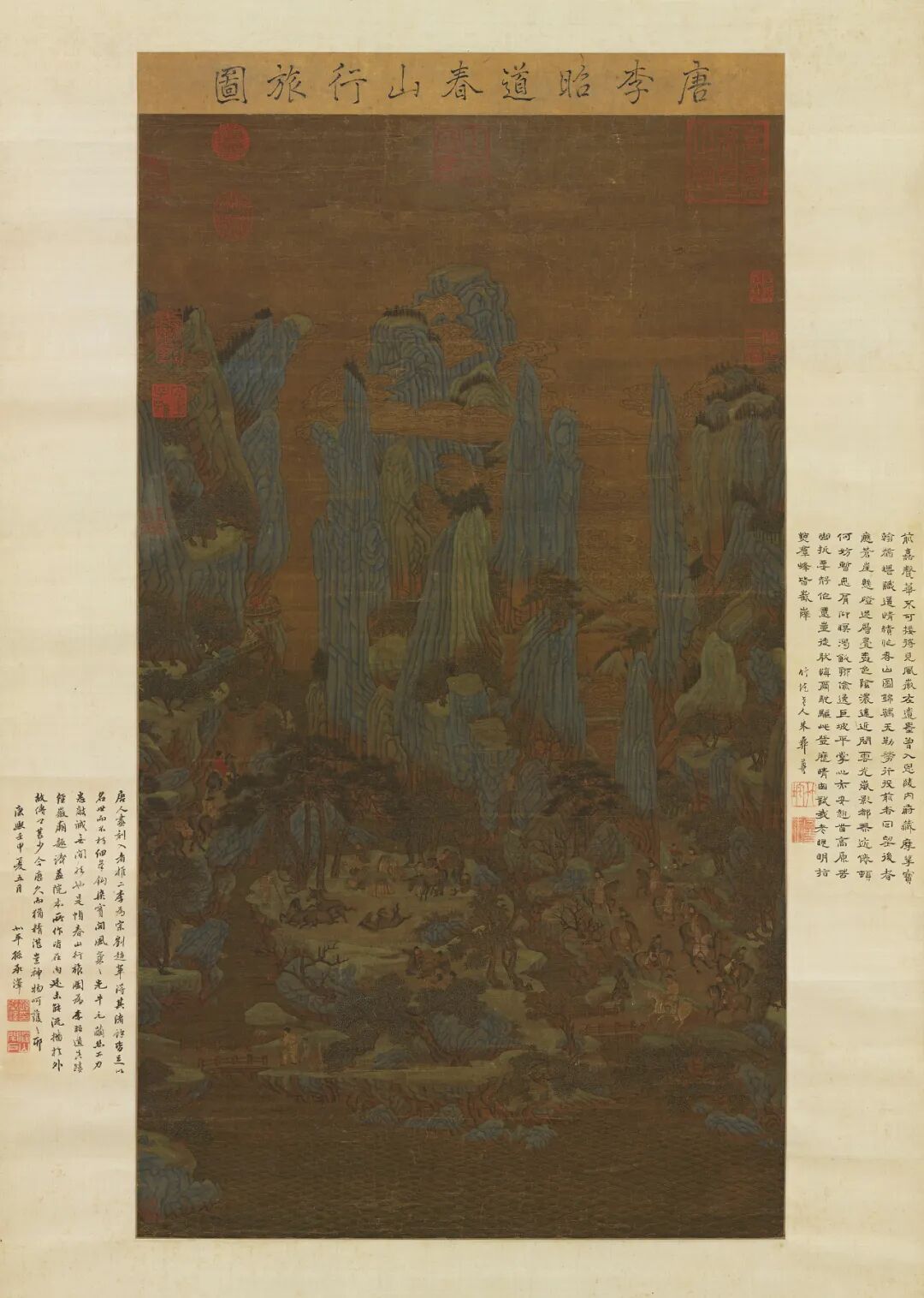 “大小李”指的便是李思训、李昭道父子。台北故宫此件《明皇幸蜀图》传为唐李昭道所绘,描绘的是唐玄宗因安史之乱入蜀的史实,为了掩盖皇帝仓皇逃窜的尴尬,画家从画面和名字上都加以修饰。虽是历史题材,但在中国传统画中被归于山水画范畴之中。