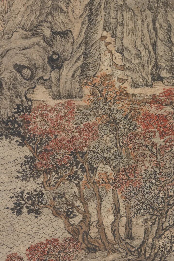众所周知,倪瓒是一个洁癖症患者,他的画基本上不设色,不仅不设色,还特别干净。但这幅《雨后空林图》,是他少见的设色作品,而且画面比他常见的作品都繁复,是倪瓒风格里难得的特例。