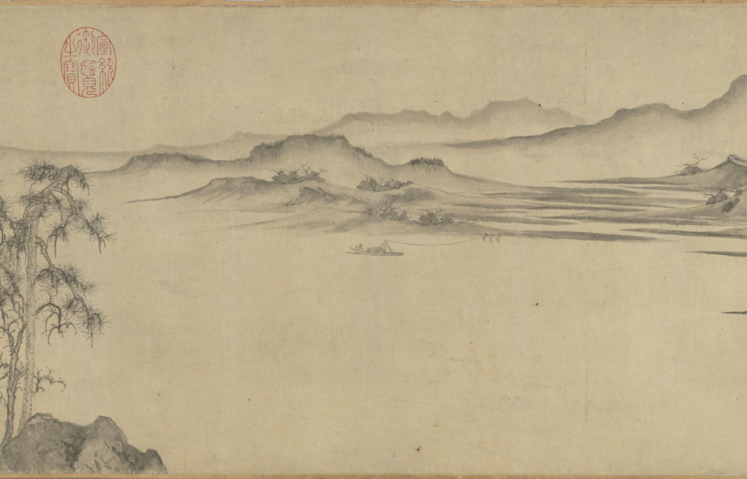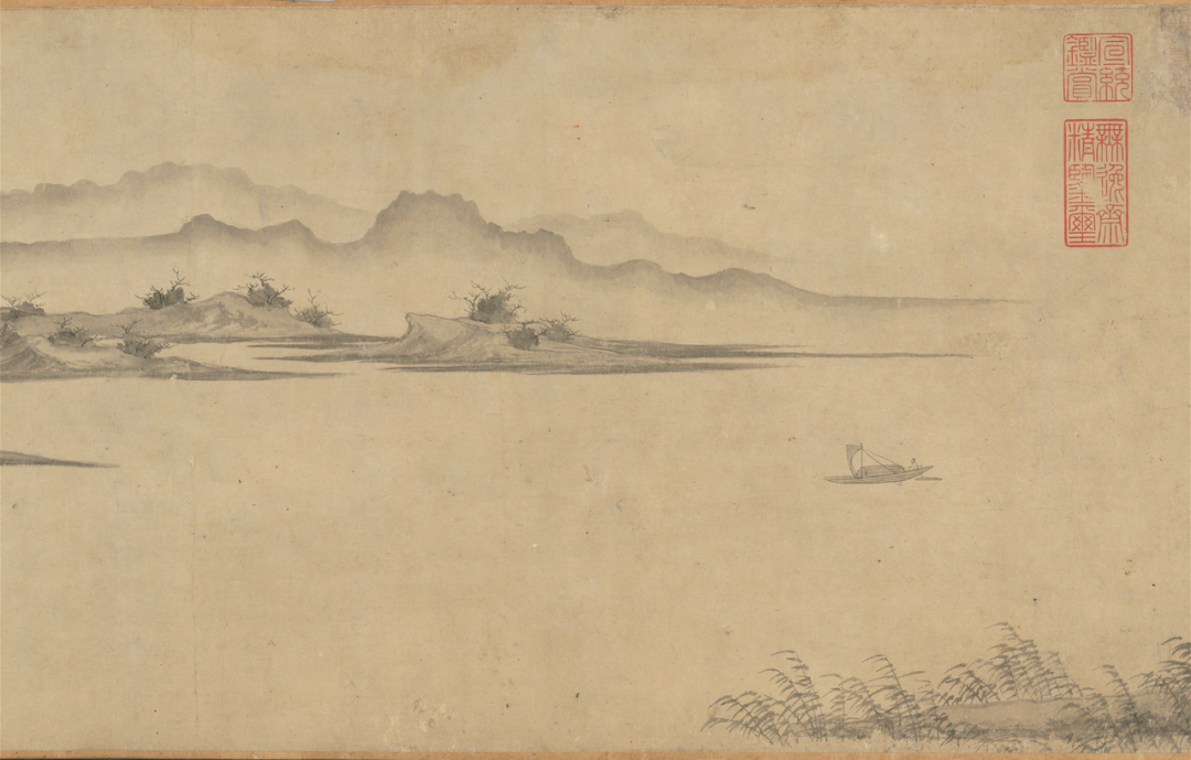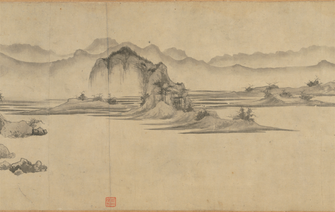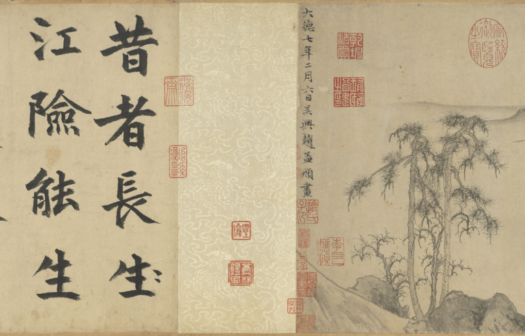 本幅是赵孟頫1295年为周密(1232-1298)描绘山东历城地区的风光,抚慰周氏对故乡的想像。划分三段,首段华不注山,末段鹊山,两山都在后方,中段大片水泽在前,三段相连成一片开阔平远的视野。其间点缀茅舍、渔人,营造出恬淡平静的气氛。通卷以单纯、内敛的中锋笔法,画出造形简朴的林木、坡岸、山石、人物,体现赵氏学习董源(约10世纪)风格,去巧媚而归古拙,借古开今的艺术思想。