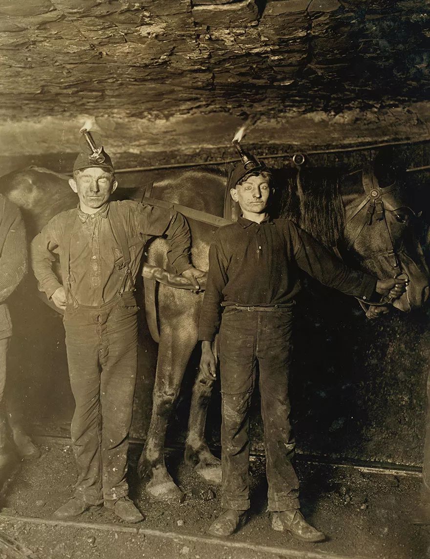 西弗吉尼亚的一家矿井,两个孩子牵着马在运送矿石