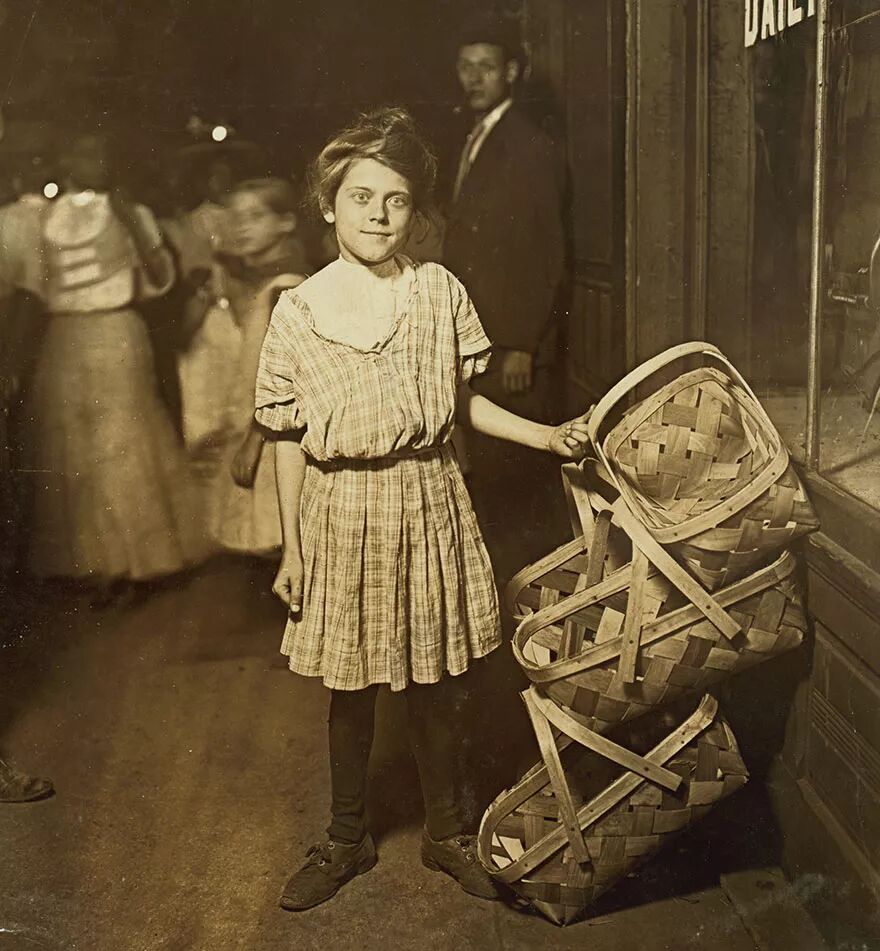 照片上的小姑娘12岁,她每天都要来市场卖篮子,5美分一个,从早上开始工作,一直干到晚上10点。