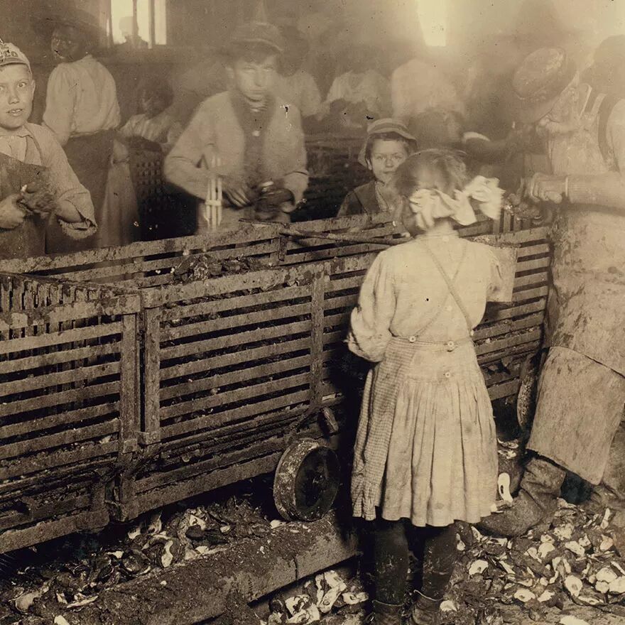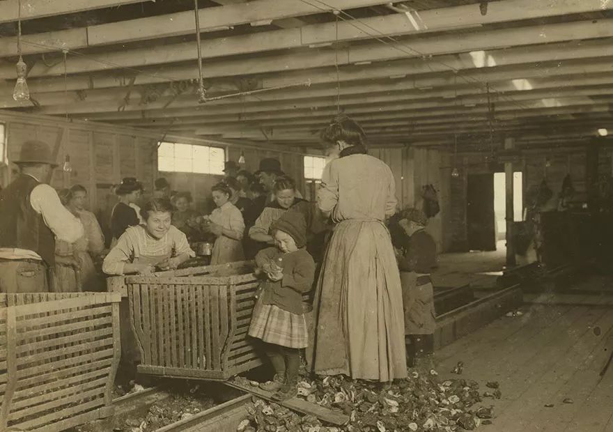 照片中间的小姑娘名叫玛丽,当时只有四岁,她的工作是开牡蛎,每天要处理两筐,其余的时间则要去照顾婴儿……