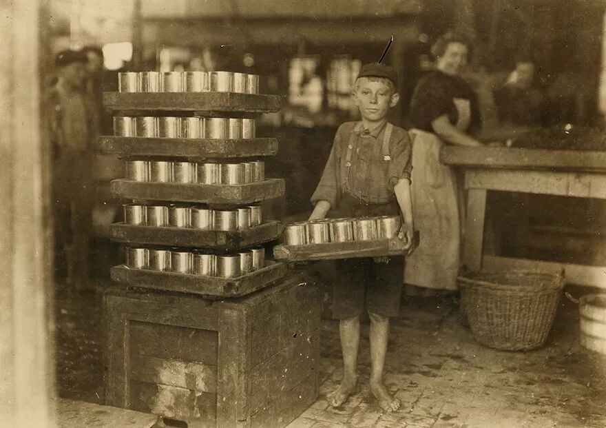 马里兰州的一个罐头厂里工作的小男孩,连鞋子都没有得穿……