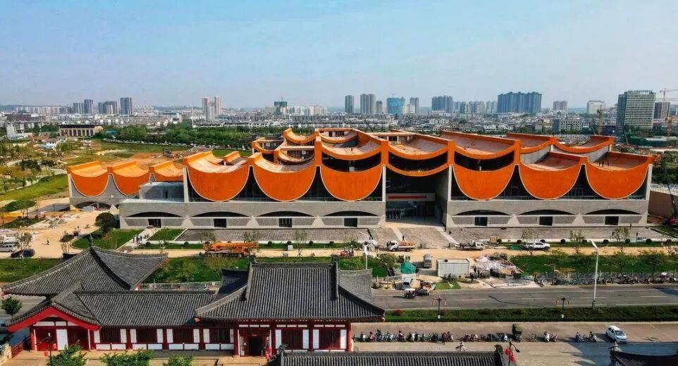 建筑简介:博物馆建筑外立面及屋面,大面积使用了黄色的三彩釉面瓷砖,只能说这配色选的一整个大翻车!本来设计师想让建筑穿上一件三彩陶瓷“外衣”,远看如同古代宫殿建筑群的天际线。但好家伙有点像那个啥!