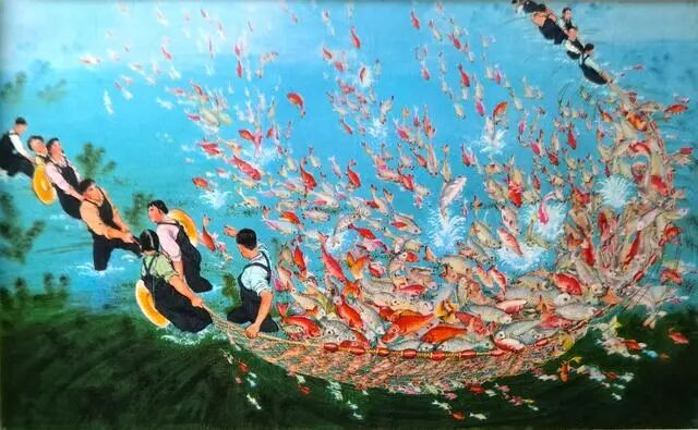 31、1975年出版的《公社鱼塘》年画,作者是董正谊,这是著名的户县农民画,在公社的鱼塘里,社员们相互协作,拉起了一张大网,鱼儿成群结队被网团团拉住,丰收的喜悦洋溢在每个人的脸上。