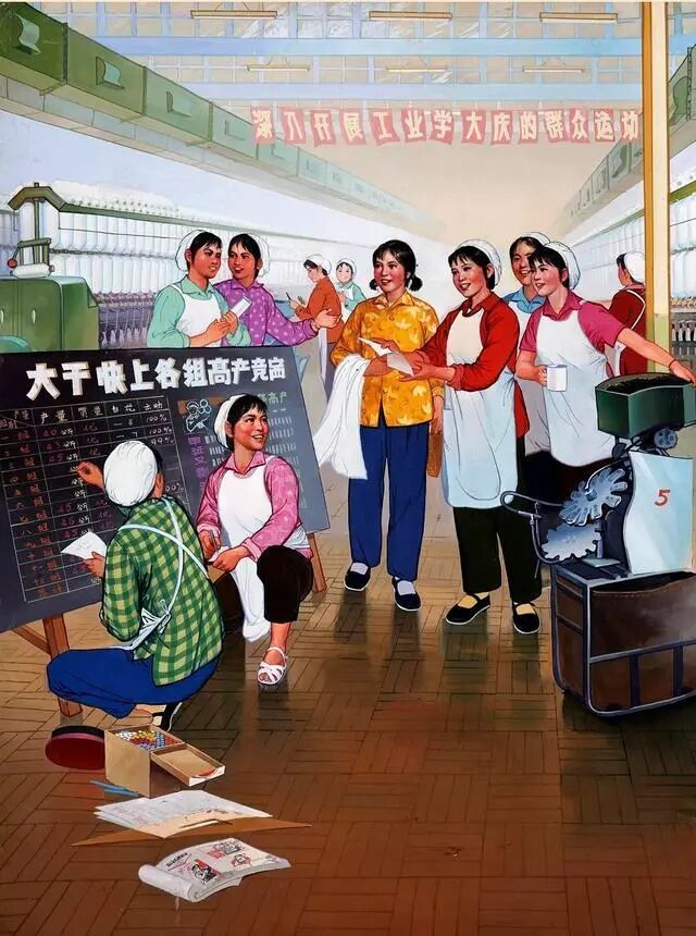 32、1974年出版的《敢教日月换新天》年画,作者是北京市农林局、水利局工人业务美术创作组,在治理海河的工地上,红旗招展,参加建设的队伍浩浩荡荡,漫天的红潮,见证了那个时代敢教日月换新天的豪迈。