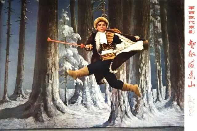 38、1970年出版的《智取威虎山》年画,这是样板戏的摄影年画,打入敌人内部的杨子荣,正在林海雪原里,踏马飞奔。