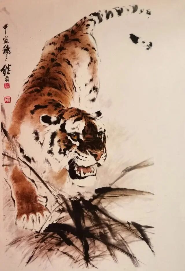 39、1979年出版的《虎》年画,作者是刘继卣,一只斑斓皮纹的老虎,虎眼露着精光,蹑着虎爪,正在靠近着猎物。