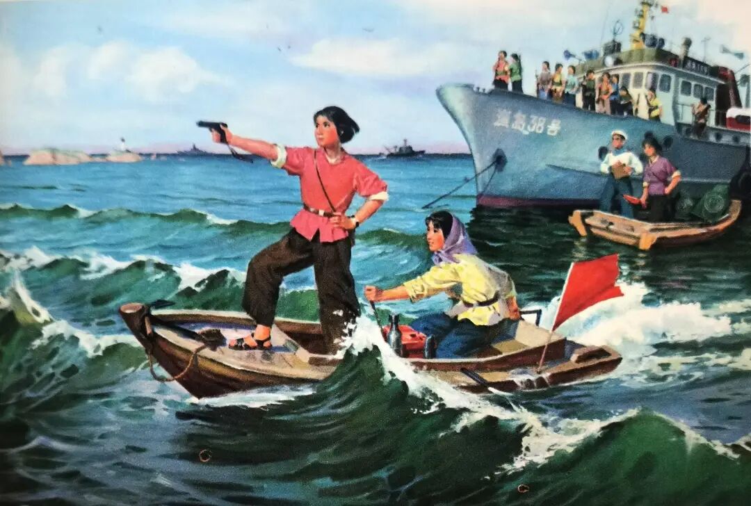 45、1979年出版的《飒爽英姿》年画,作者是王言昌、刘泽文,在奔涌的大海上,一支民兵队伍正在训练,领头的小船上,一位身穿红衣的女民兵,站立船头,举枪向前,英姿勃发。
