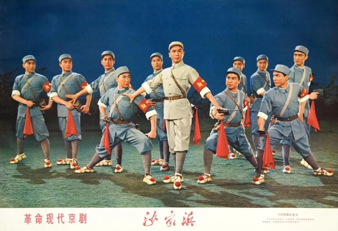 43、1971年出版的《沙家浜》剧照年画,抗日战争时期,新四军某部18名伤员在指导员郭建光的带领下,来到沙家浜养伤。后来遭遇日伪军的扫荡,被当地群众转移他处,这是后来郭建光率领新四军战士连夜奔袭,杀回沙家浜,全歼敌人的一幕 。