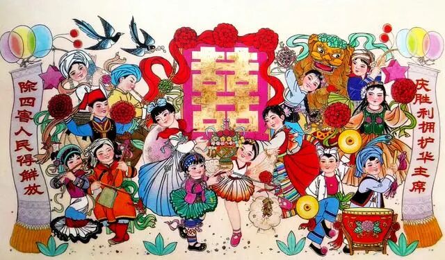 24、1979年出版的《双喜》年画,作者是步万方,韩祖音,郝之辉,两侧的气球悬挂着标语,人们载歌载舞,庆祝着四害被扫除,中间的喜字寓意着新的时期已经到来。