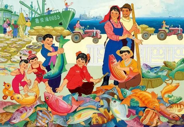 29、1978年出版的《丰收年》年画,作者是张恩杰,在海滨的道路上,一位女司机驾驶着红色的拖拉机,三位年轻的女社员站在装满渔获的拖斗里,两侧的麦田翻起了金黄色的麦浪,海鸥飞翔在蓝色的海面上,这是一个丰收的年景。