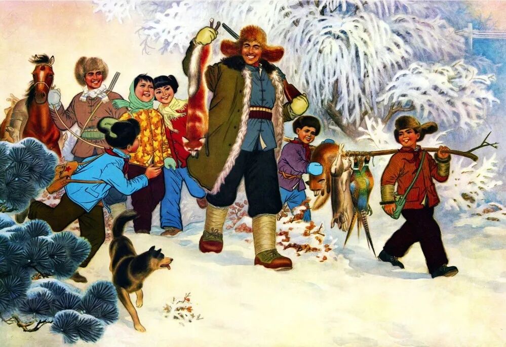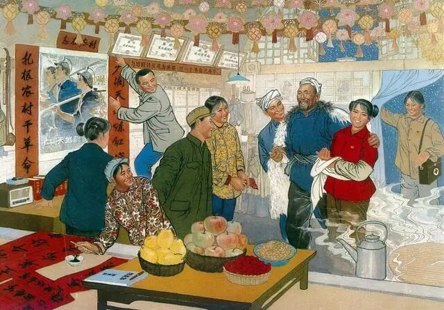 15、1977年出版的《集体户的除夕之夜》年画,作者是夏振萍,一群知识青年居住在一起的集体户内,除夕之夜,人们喜笑颜开,过着充实而热闹的新年。