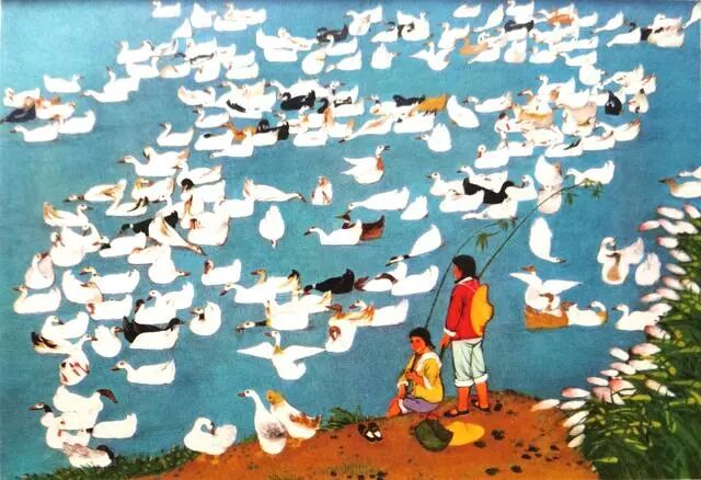 40、1975年出版的《大队鸭群》年画,作者是李振华,在池塘里,两个女社员,手里拿着竹竿,站在岸边,一大群鸭子正在水里欢快地边游动边吃着。