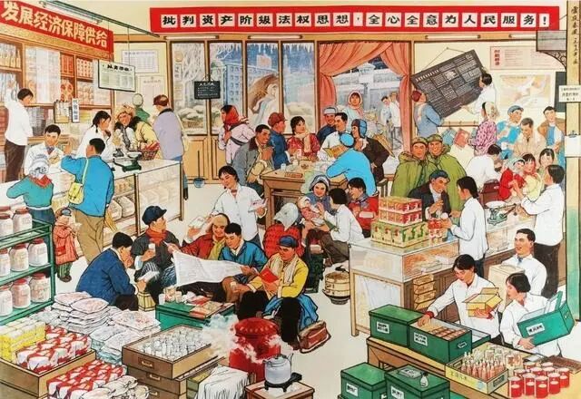 21、1976年出版的《雪夜春风》年画,作者是陆一飞、张桂铭、徐志文 ,在供销社里,户外是大雪纷飞,里面确实人头攒动,为了全心全意为人民服务,哪怕到了晚上,也是开门营业。