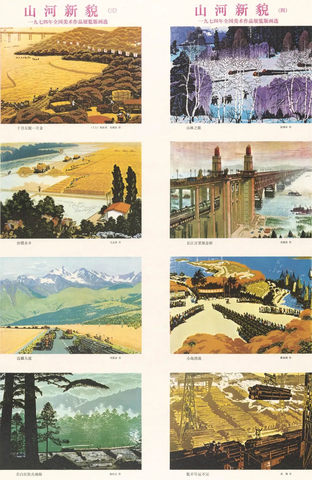 42、1974年出版的《山河新貌》年画,这是选自一九七四年的全国美术作品展览中的版画作品,左上第一幅是《十月丘陵一片金》由祝富荣、毛翔先创作,右一是《山林之歌》由杜鸿年创作,左二是《沙漠水乡》有马永沛创作,右二是《长江万里架金桥》有吴俊发创作,左三是《边疆大道》由刘凯业创作,右三是《小岛洪流》由蒙显刚创作,左四是《长白红松出林海》由赵纪元创作,右四是《装不尽运不完》由晁楣创作。