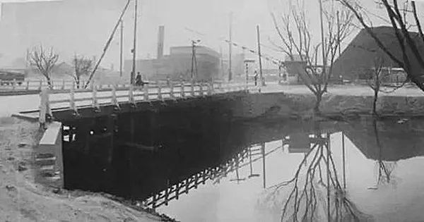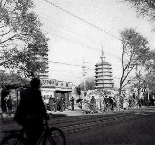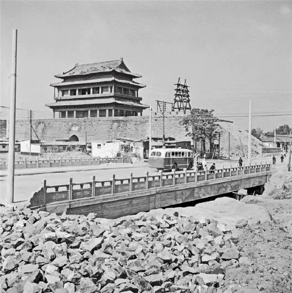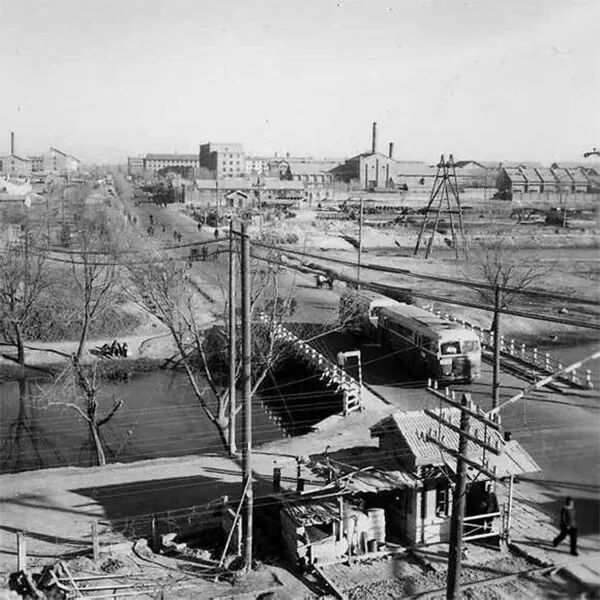 1953年,广安门护城河桥(北向)。可见天宁寺塔,桥上的公共汽车是1路,从广安门开往安定门,过桥右拐是终点站,后来是4、9路无轨电车站。
