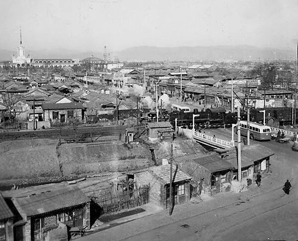 1953年,朝阳门城楼东北面,环城铁路道口。此图当为城楼最后遗照,当年10月即下令拆除。