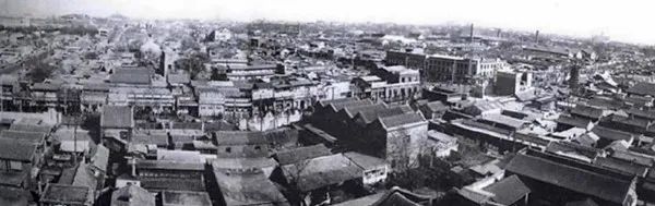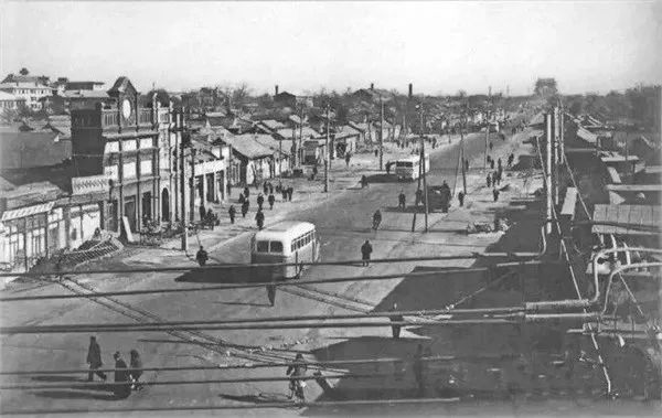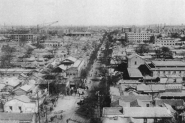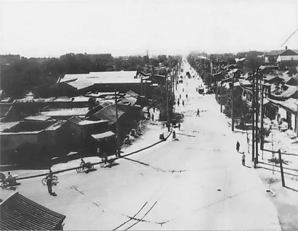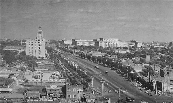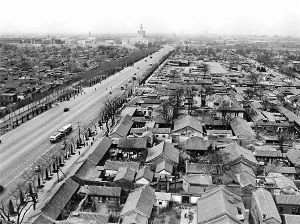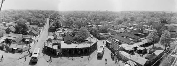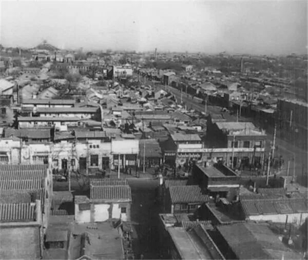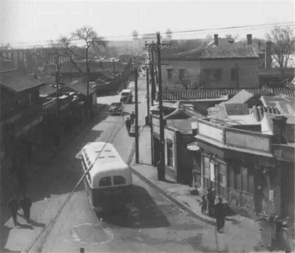 1951年,崇文门内大街东交民巷东口,由城楼上向北拍摄,左边的建筑是老同仁医院,远处的高大建筑是德国医院,现即北京医院。