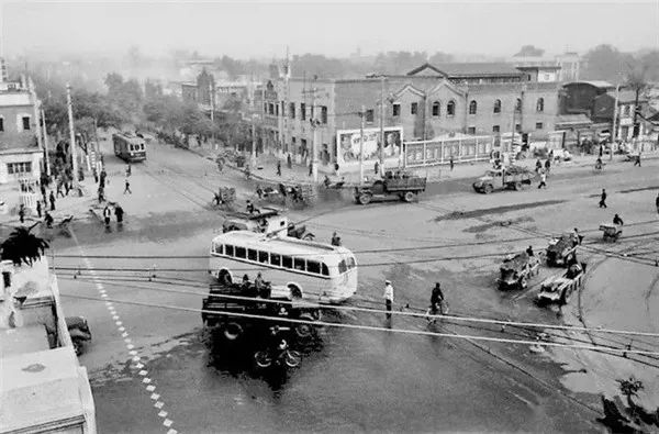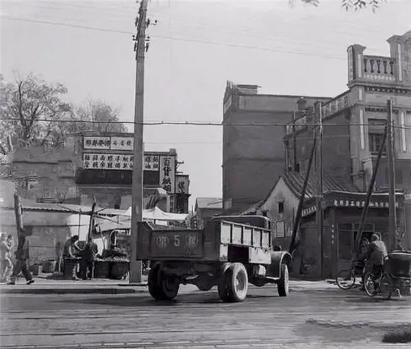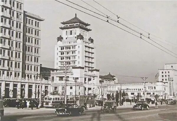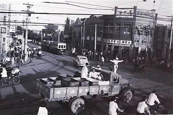 1953年,西单路口东南向。路上的交通工具有1辆日本丰田卡车,波兰华沙20轿车,有轨电车,人力三轮车和自行车。