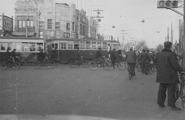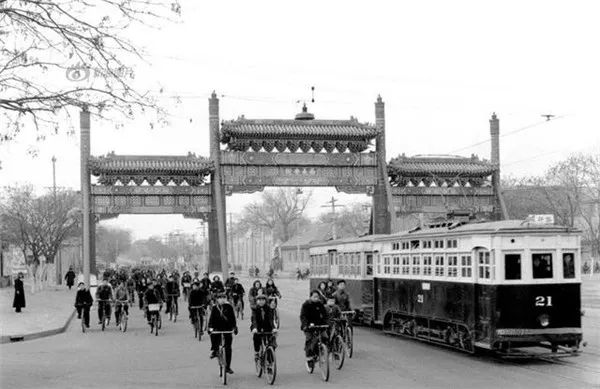 1952年,西长安街牌楼下通过的有轨电车和自行车(西向)。