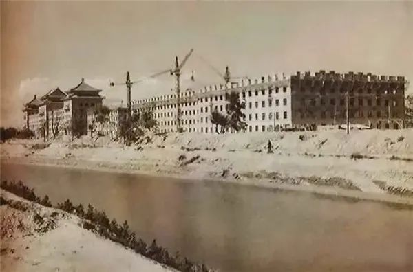1950年,长安右门西长安街,正在修建外金水河南面的简易观礼台。可见大理院建筑,此时已为高法和高检接管使用。