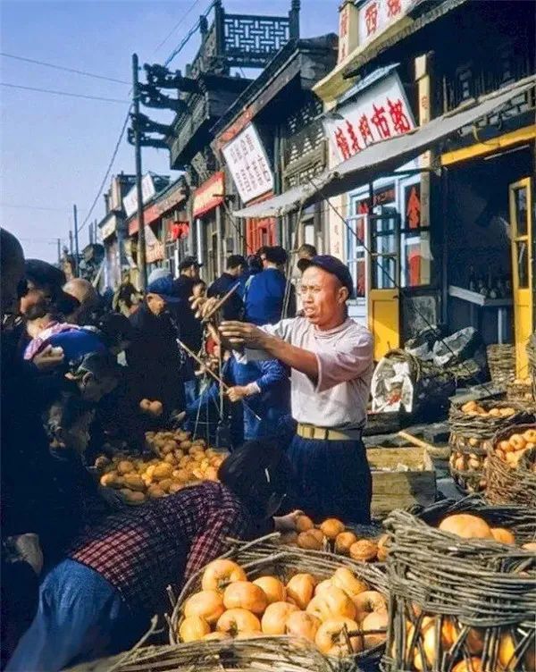 1952年,猪市大街隆福寺街口,东四人民市场已挂牌经营,隆福寺山门就是市场大门,商户都进了庙。这会儿董老还没给题字呢,那是等拆了隆福寺山门,盖了新门脸儿写的。