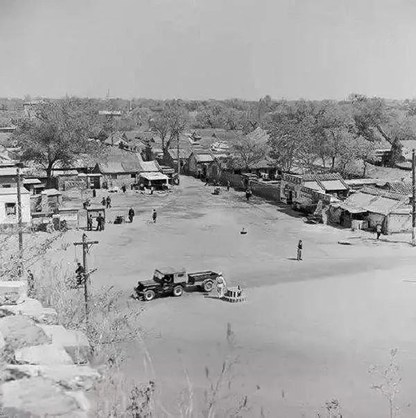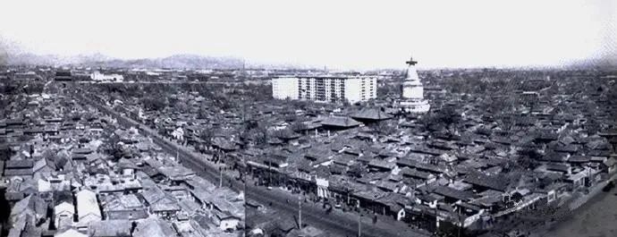 1954年,复兴门内,卧佛寺街(北)和邱祖胡同(南)西口,两年后在这里将开辟出复兴门内大街。东南方向远处可见宣武门城楼和南堂。由复兴门门洞上方城墙上向东拍摄。