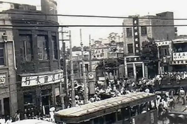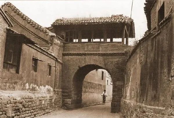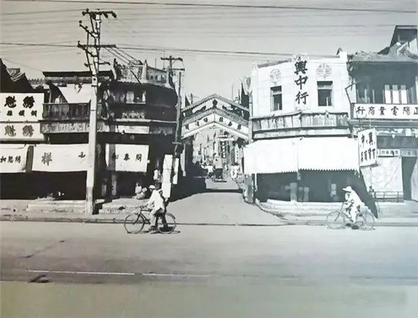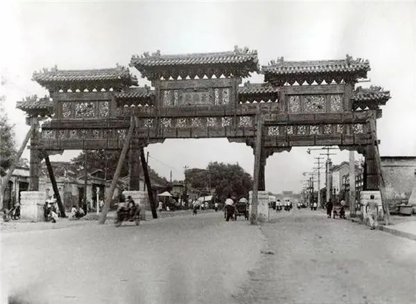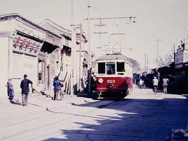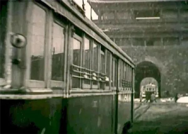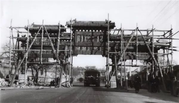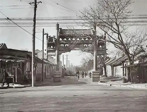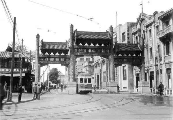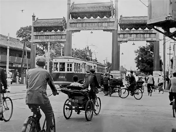 1953年,西四牌楼北向,有轨电车通过北大市街牌楼,画面左侧是转角楼新华书店朝东的铺面房。