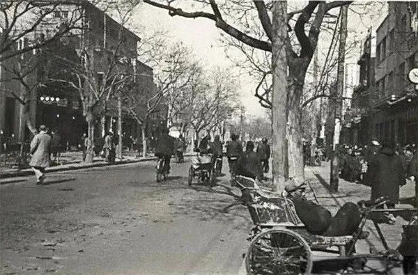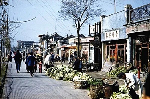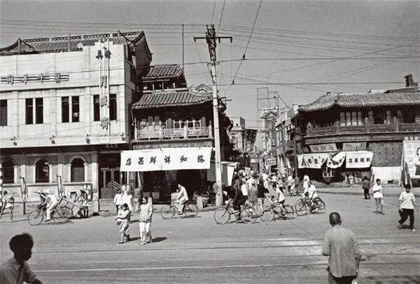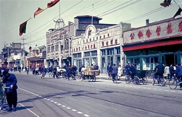 1951年,前门大街北向。可见道路上的交通工具还是以自行车和人力三轮车为主,店铺和幌子还基本保留着民国时的风格。