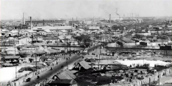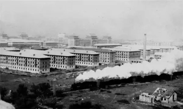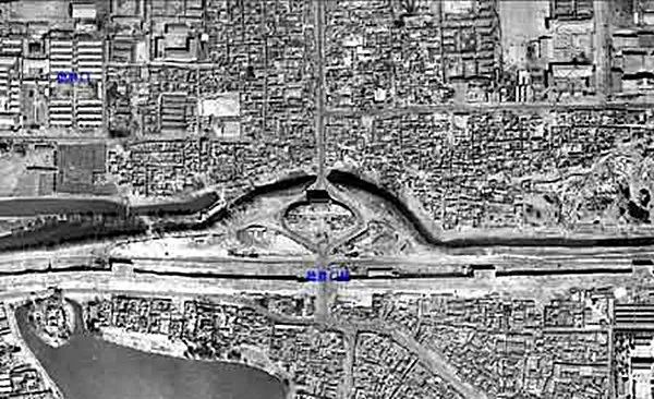 1950年,建国门外护城河桥,护城河内沿的环城铁道,建国门外大街。从古观象台向东偏北方向拍摄,城外附近还是基本荒芜,稍远芳草地以东可见有东郊的工业建筑。