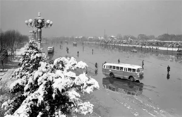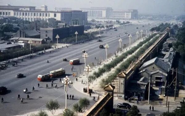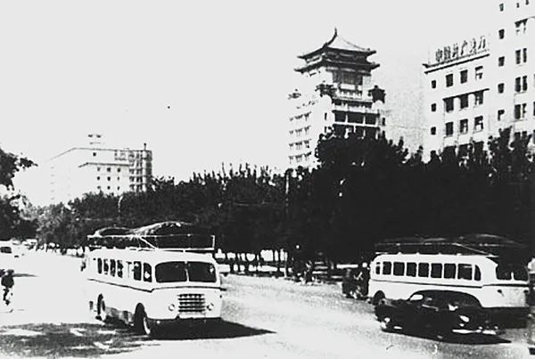 1960年,长安街改造完成,刚栽上行道树,撤除了有轨电车轨道,大会堂和历史博物馆已建成。街上行驶的公共汽车是4路环行和10路,正准备进站(东长安街南河沿)。