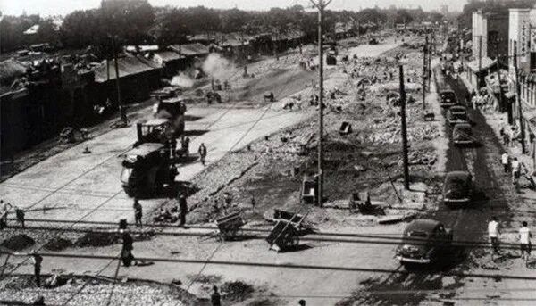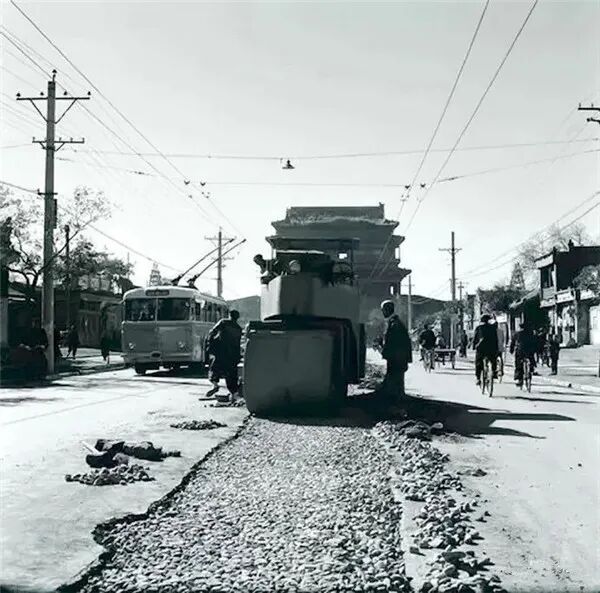 1951年,和平门内侧,前门西顺城街正在铺装路面。远处城门为宣武门。