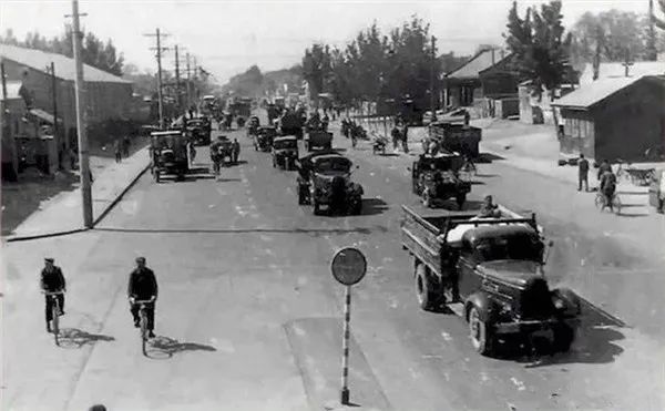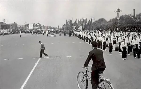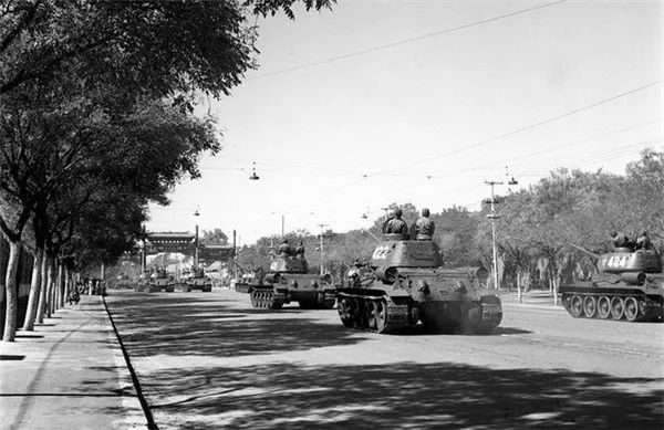 1952年,西长安街。国庆阅兵的坦克车队通过天安门广场后行进到中南海新华门前,前方是西长安街牌楼。