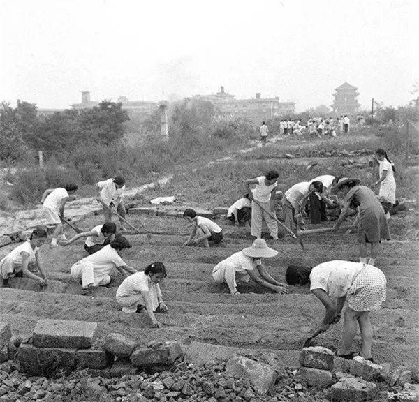 1960年,内城南垣崇文门迤西城墙上,女学生们在开辟田垄种菜,可见“三年自然灾害”逼得城里人都墙头种菜了。远处是崇文门城楼和新侨饭店。