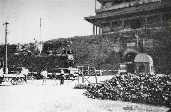 1952年,崇文门城楼西南面(西券洞铁道口)。崇文门城楼屋面蒿草茂密,已显破败。瓮城于1950年拆除,为便利交通,在城门西侧城墙上开辟了一个券洞,城墙新修补的痕迹尚在,火车头正穿越原瓮城双向铁路券洞(闸楼)位置。