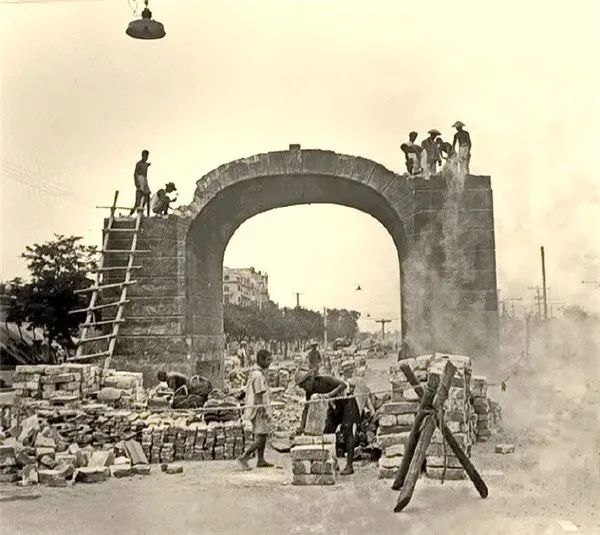 1951年,北京市政府建设局和卫生工程局,对东、西长安街进行清理改造。图为工人正在拆除东长安街三座门。