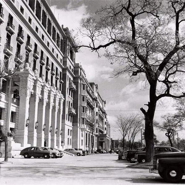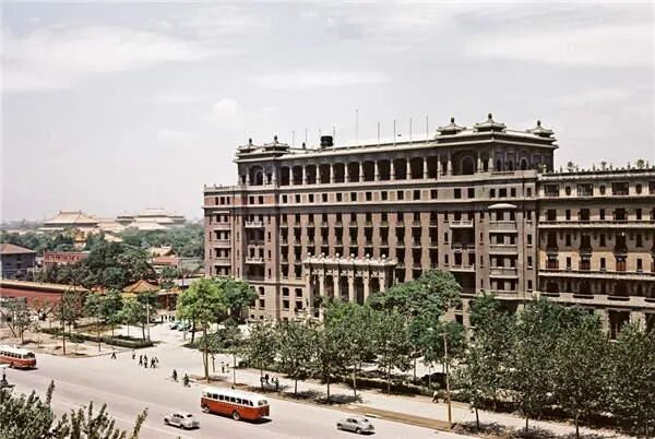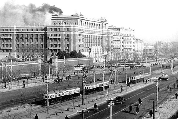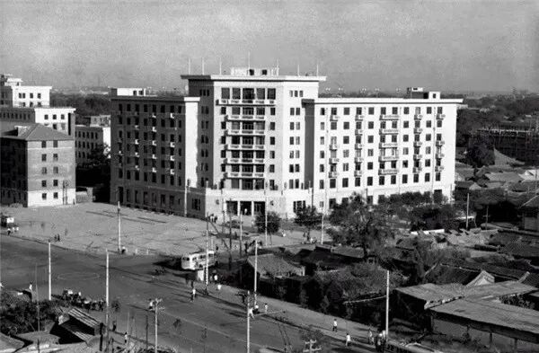 1954年,东长安街南河沿路口,有轨电车在道路中间行驶,新建的北京饭店西楼上烟囱黑烟滚滚,应该是暖气烧煤锅炉冒的烟。