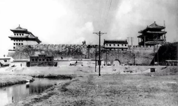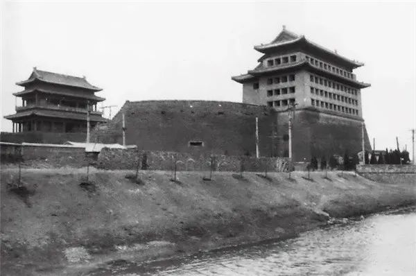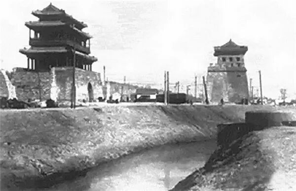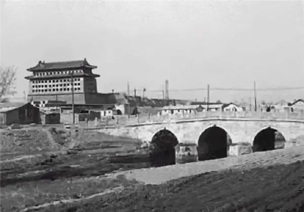 1953年,永定门西侧,拆除瓮城后,城楼两侧已扒开豁口。绕箭楼而过的外城南护城河。