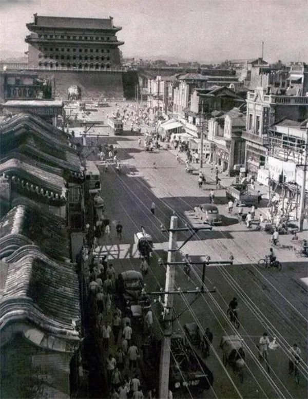 1951年,前门大街南向,京城南中轴线,南端可见永定门城楼。正阳桥五牌楼尚健在,画面左侧白色的三层小楼后来成为了大北照相馆。