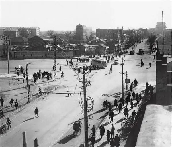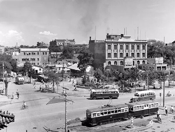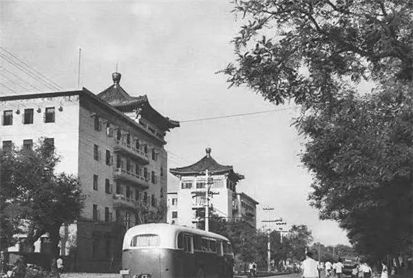 1953年,西单路口东向。西长安街还未展宽(1954年启动西长安街改造),远处可看到庆寿寺双塔还在,南侧可看到长安大戏院的牌子。向北拐弯的公共汽车应该是3路(还行线,匈牙利伊卡璐斯60型),在西长安街上行驶的是当当车。